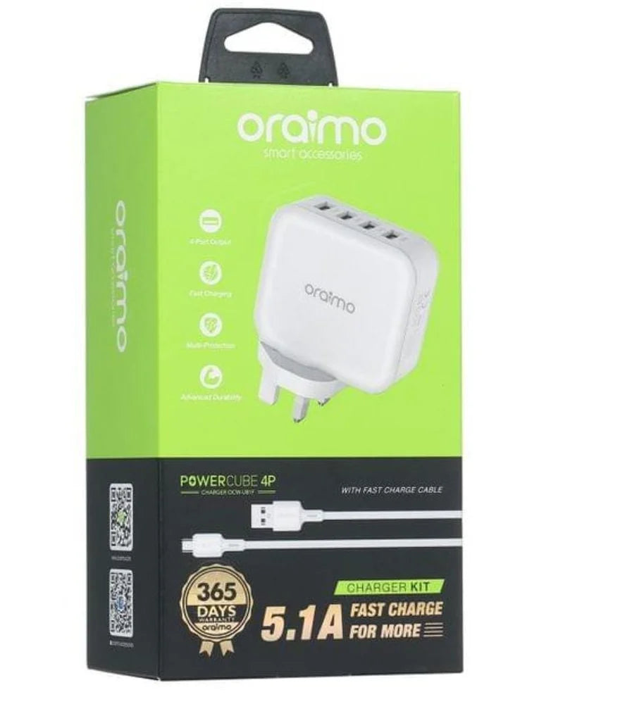 This Oraimo OCW-U94D USB-C 4 Port Charger is suitable for various mobile phones and other devices and gadgets. It is very durable, reliable, and efficient. A one-meter USB C-Type cable is included.
